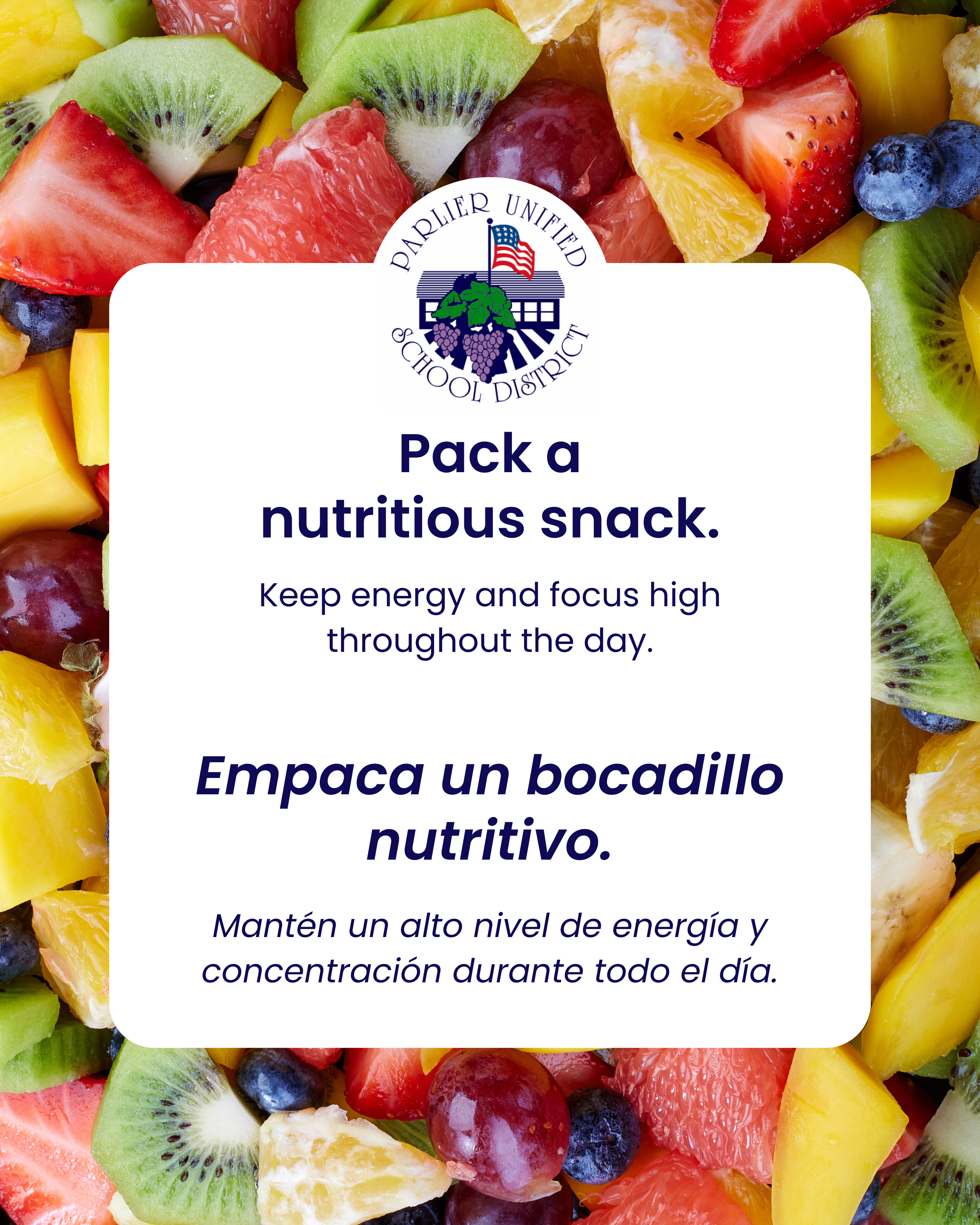 • Visita nuestra Despensa de Alimentos – Abierta cada segundo y cuarto viernes del mes, la Despensa proporciona alimentos saludables, frutas y verduras frescas y opciones nutritivas para que los estudiantes estén listos para aprender.
